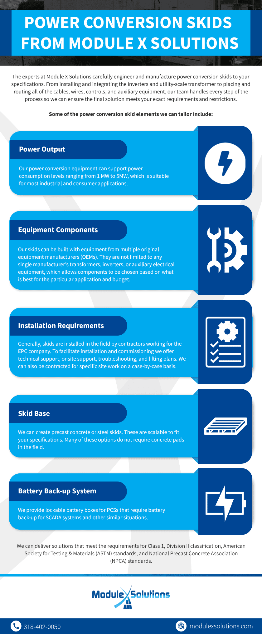 The experts at Module X Solutions carefully engineer and manufacture custom power conversion skids. From installing and integrating the inverters and utility-scale transformers to placing and routing all of the cables, wires, controls, and auxiliary equipment, our team handles every step of the process so we can ensure the final solution meets your exact requirements and restrictions. Some of the power conversion skid elements we can tailor include: